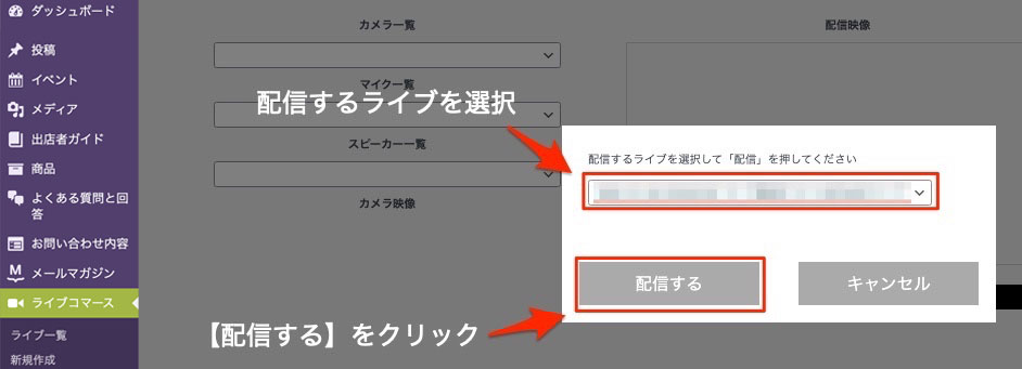 ライブ配信の予定日時になりましたら、運営管理画面から【ライブコマース】>【ライブ配信】をクリックし、ダイアログに表示される予定済み配信ライブのリストから、配信するライブを選択します。
