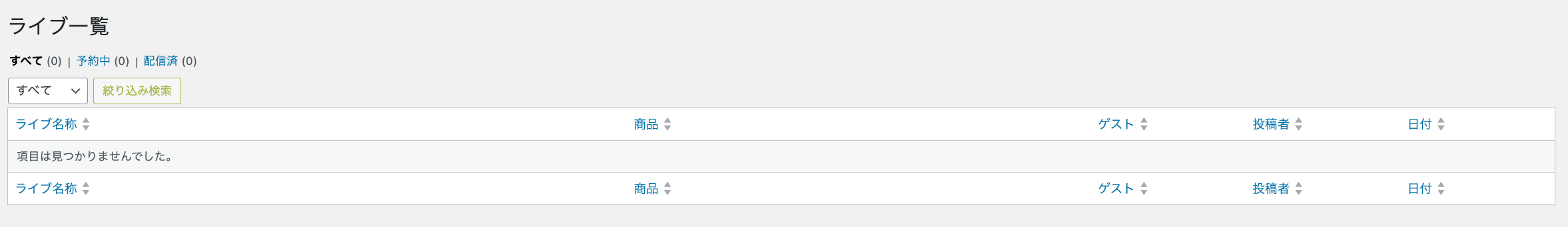 運営管理画面から【ライブコマース】>【ライブ一覧】をクリックすると登録されているライブコマースの一覧ページが開きます。